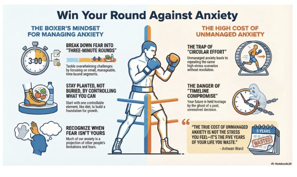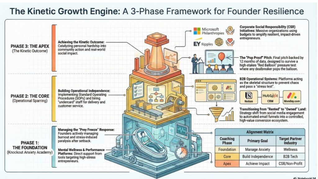 The Knockout Anxiety Academy (KAA) is our foundational program designed specifically for overwhelmed founders on the brink of burnout. When the daily chaos of your business pushes you into a paralyzing “freeze” state, KAA acts as your essential mental reset. We teach you how to step back to the “balcony”—detaching from immediate emotional stress to gain clear, strategic perspective. It is the crucial first phase of mental preparation required to escape overwhelm, stop trading your health for revenue, and step back into the ring with renewed focus.